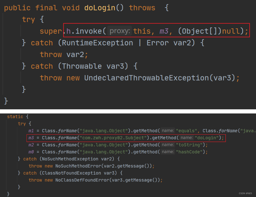 可以看到doLogin()方法就是执行的super.h.invoke(…)方法,m3就是方法名;